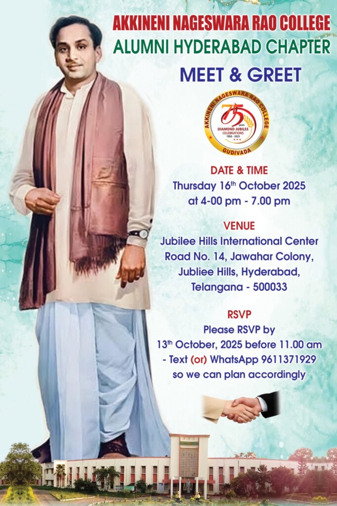 Dear former students, the registration deadline for the Akkineni Nageswara Rao College Hyderabad Chapter Diamond Jubilee Meet and Greet Event is approaching. Please register your name before 9:00 AM on October 14th.